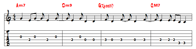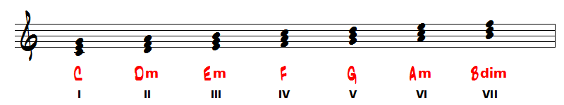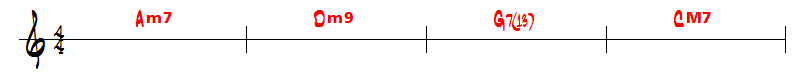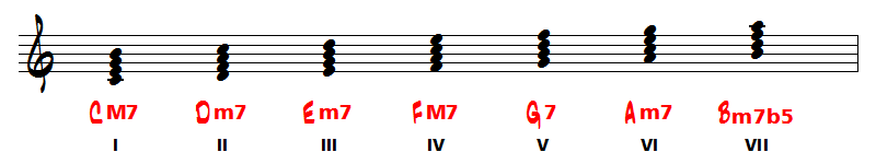 Ce titre est donc clairement en Do majeur (pas d'altération à la clé). Commencez donc par retrouver les accords de 3 et de 4 sons (accords septièmes) que vous écrivez à partir de la gamme de Do majeur :