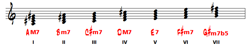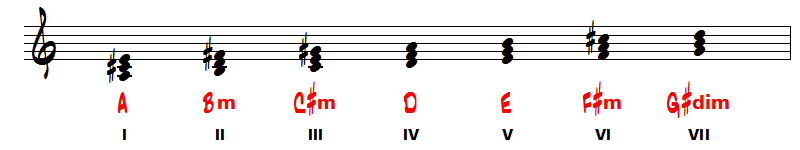 Nous voyons maintenant que nous avons modulé en La majeur avec les 3 dièses à la clé. Ecrivons les accords de cette tonalité :
