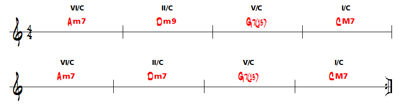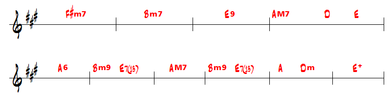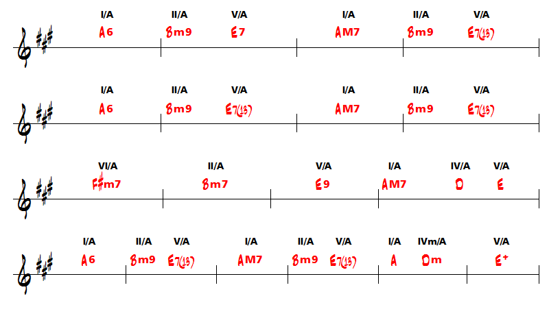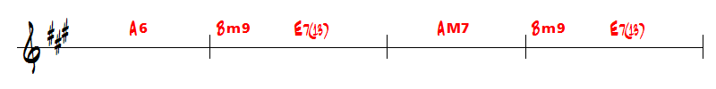 Et une 2ème partie qui substitue de façon passagère le degré I (A6 ou AM7) par le degré VI (F#m7) puis un retour sur les II-V-I