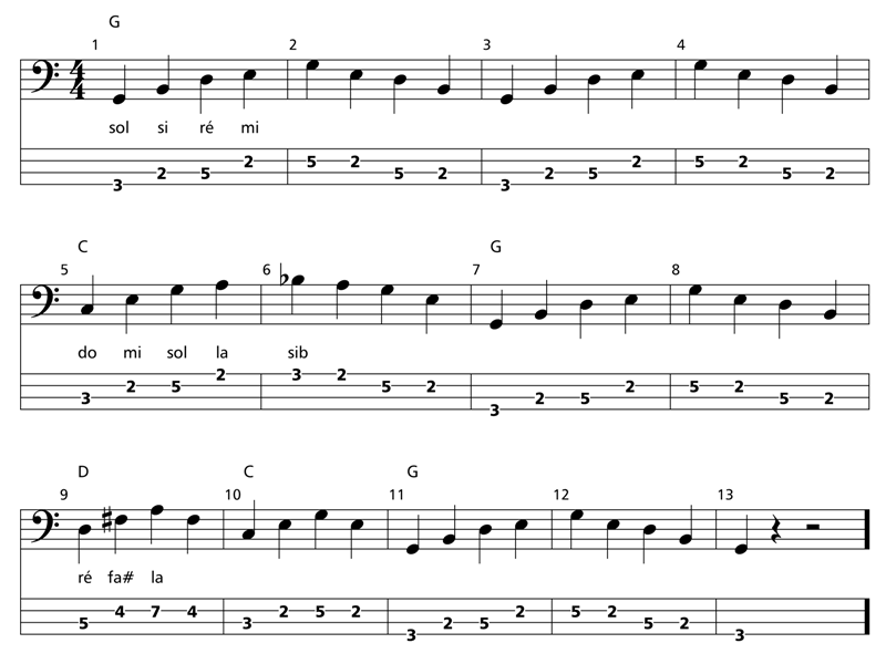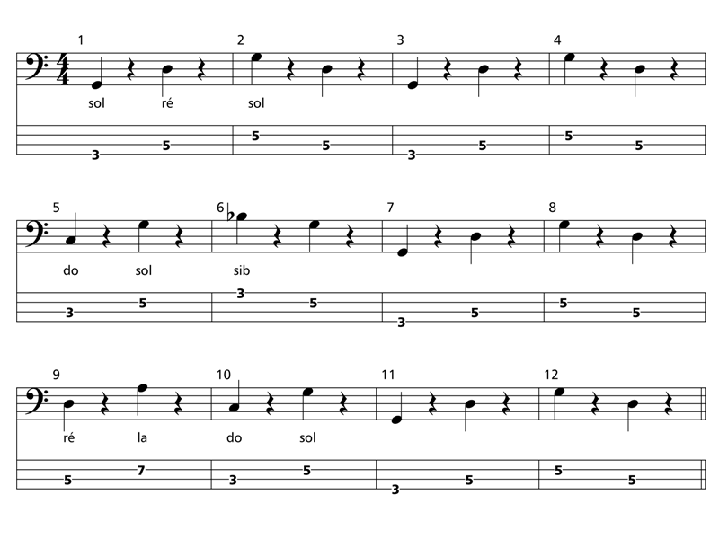 Attention, cette ligne de basse utilise tous les doigts de la main gauche, ce qui n’est pas évident. Vous pouvez aussi revenir sur cet exercice un peu plus tard, lorsque vous aurez acquis une meilleure technique main gauche.