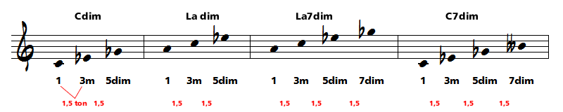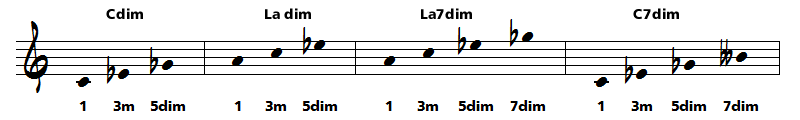Une triade diminuée (accord de 3 sons) est constituée d'une fondamentale, d'une tierce mineure et d'une quinte diminuée. Dans l'accord de septième diminuée (7dim), on ajoute l'intervalle de septième diminuée :