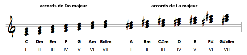 On trouve les triades diminuées sur le degré VII de la gamme majeure :