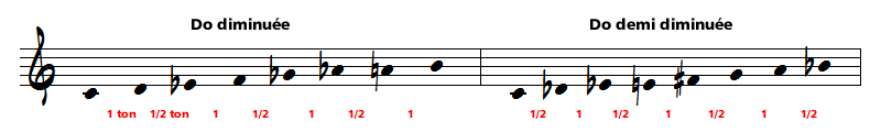 Les gammes correspondants à ces accords diminués sont au nombre de deux. Notez les intervalles constants qui séparent leur notes. Les notes de la gamme diminuée se suivent par ton et demi-ton. C'est l'inverse pour la gamme demi diminuée (demi-ton, ton) :