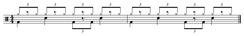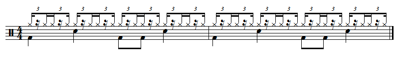 Dans un rythme trinaire on mélange feeling binaire et ternaire. Prenons pour l'exemple des rythmes de batterie. Vous connaissez surement le rythme shuffle, rythme avec feeling ternaire écrit en 4/4 :