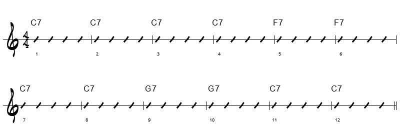 Si vous voulez jouer rapidement, contentez-vous de savoir que le blues est un morceau basé principalement sur une mesure 4/4 avec 3 accords principaux joués sur une grille de 12 mesures.