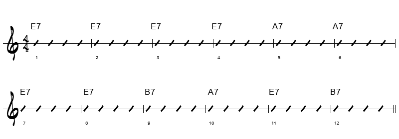 Par exemple un blues majeur en Mi est basé sur les accords E7, A7 et B7 :