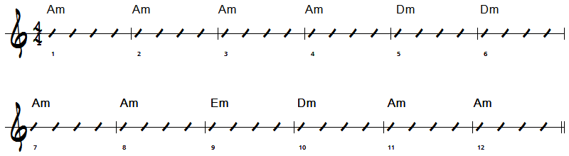 Le blues mineur le plus simple est basé sur 3 accords mineur cette fois. Un blues en Lam est construit sur les accords Am, Dm et Em : :
